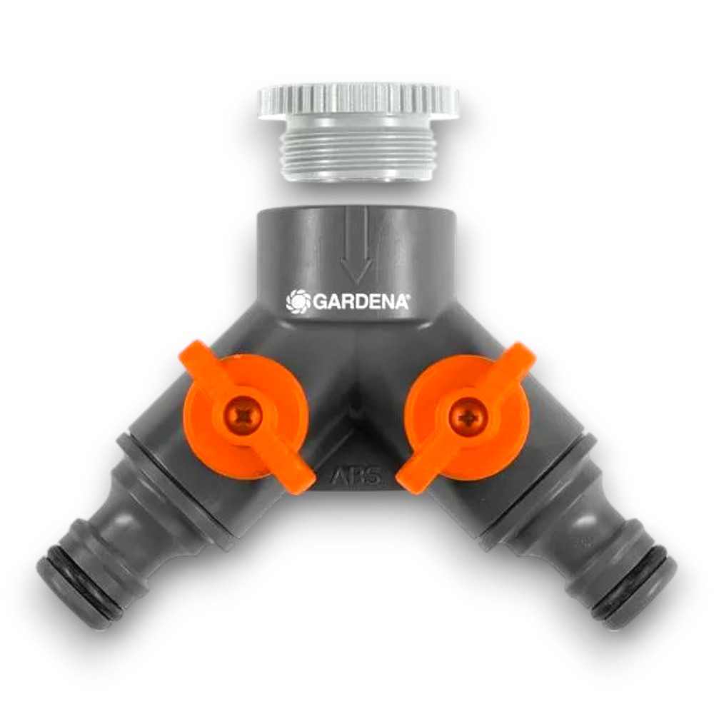 Tvåvägskran med adapter för samtidig användning av två vattenredskap. Detta innebär att du inte behöver byta mellan två olika slangar vid kranen. De två utloppen är fullt reglerbara, oberoende av varandra. Passar kranar med 26,5 mm (G 3/4″) och 21 mm (G 1/2″).