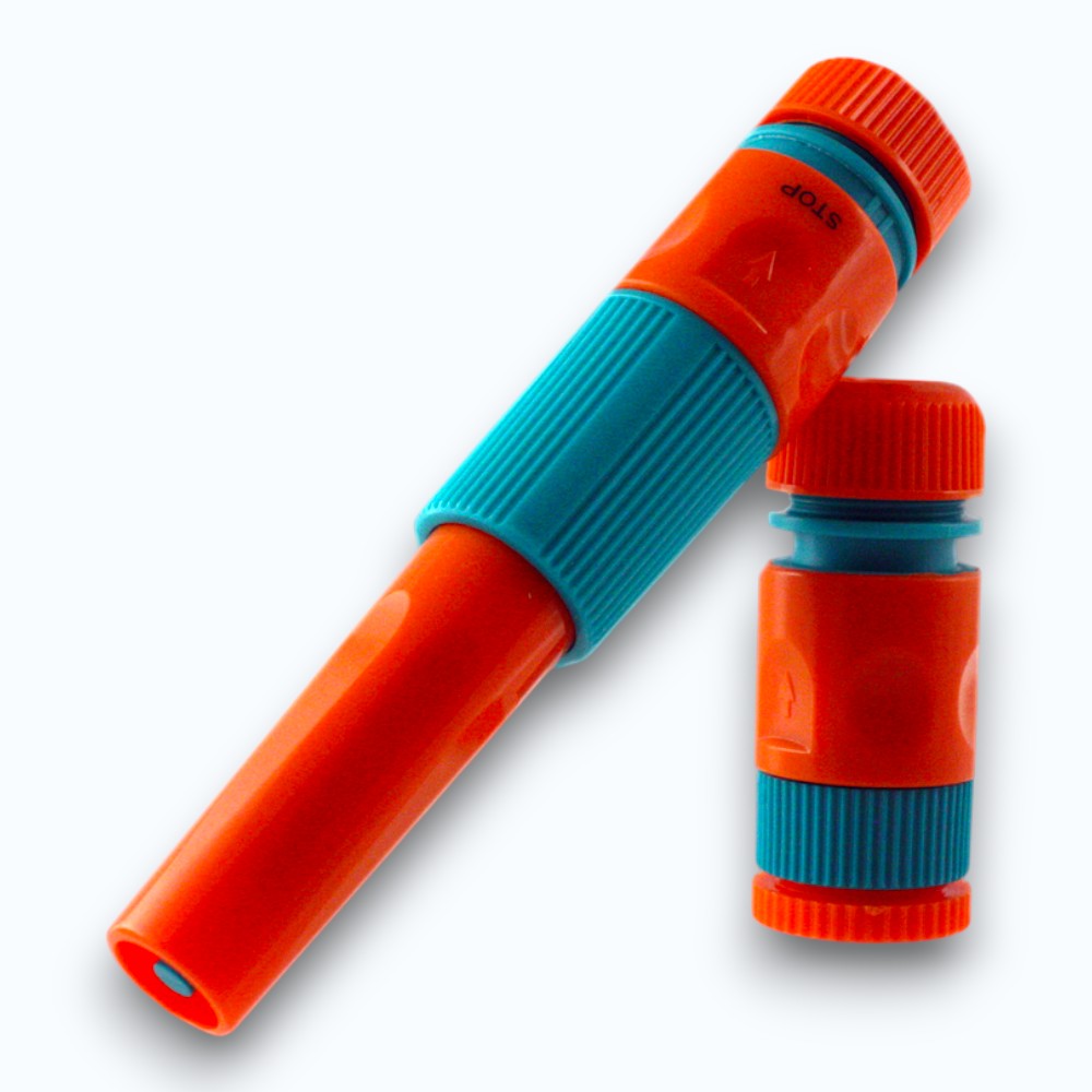 Montera delarna på 1/2″ vattenslang enligt anvisning. Justera munstycket för önskad vattenstråle och börja vattna. Efter användning tas setet enkelt isär för förvaring.