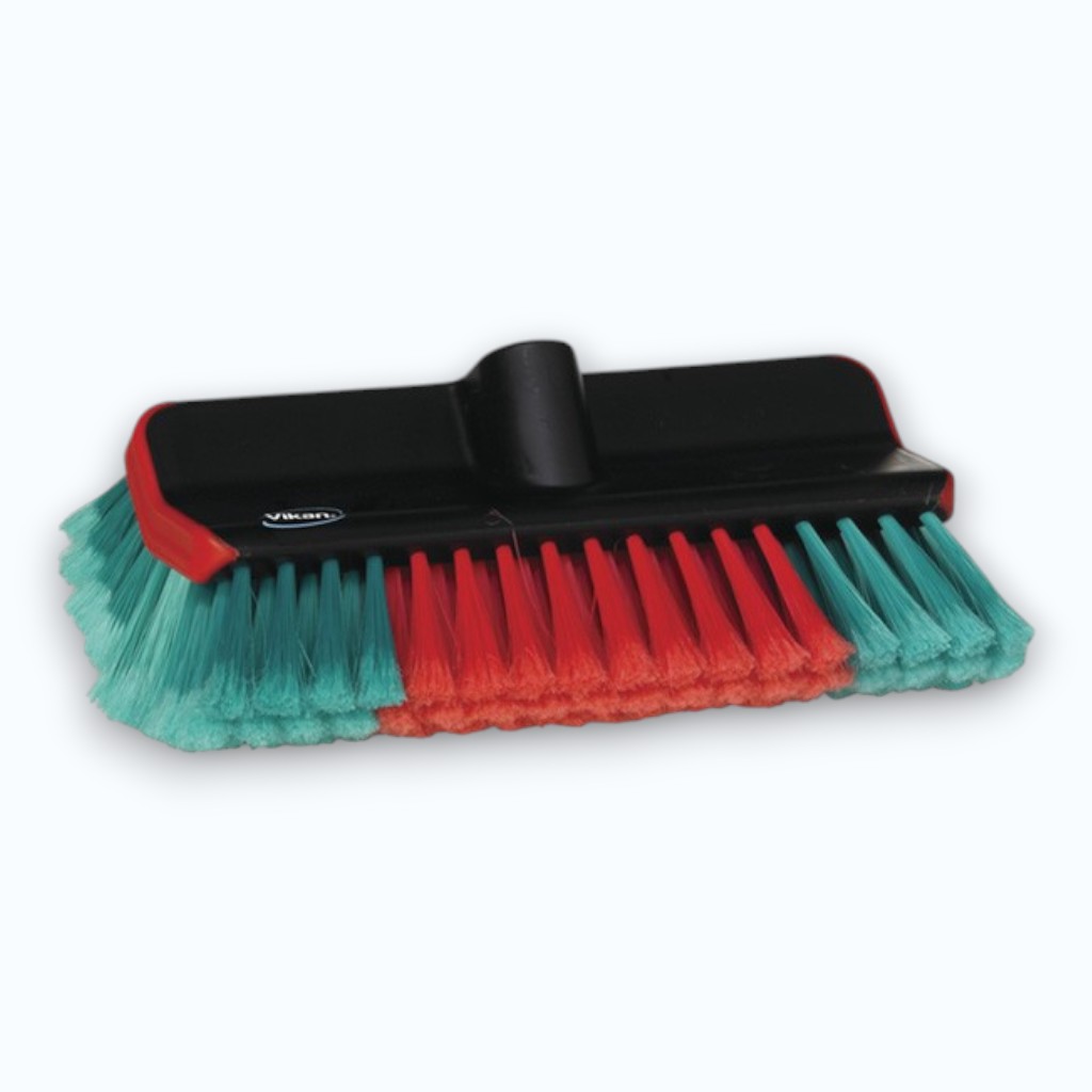 Vikan Vattenmatad borste. Den vinklade designen av högt/lågt borsthuvud gör att fibern kan ha oavbruten kontakt med ytorna under tvättningen, speciellt med den höga nivån. Gummikanten minskar risken för repning av de rengjorda ytorna.
