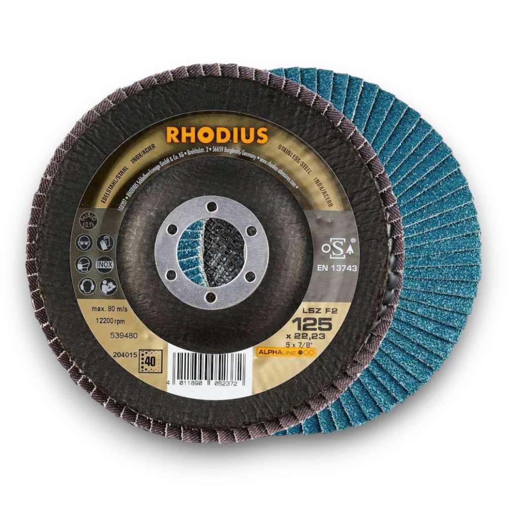 Maskinlämplighet: Denna lamellskiva är lämplig för användning på vinkelslipar från alla prestandaklasser, inklusive lågeffektsmaskiner och batteridrivna maskiner. Materiallämplighet: RHODIUS LSZ F2 klaffskiva har utformats speciellt för bearbetning av rostfritt stål (t.ex. V2A, 1.4301), stål (kolstål – även kallat konstruktionsstål, St37, S235JR och 1.0037) och gjutstål. Skivan erbjuder en mycket hög nivå av avverkningsprestanda. Konstruktion och tillverkning: Skivan är tillverkad enligt EN 13743, säkerhetstestad och certifierad enligt oSa-standarder. Produkten har en stödplatta i glasfiber. Användare kan arbeta med högt kontakttryck med denna produkt. LSZ F2 använder ett slipkorn av zirkonium av hög kvalitet. Alla RHODIUS lamellskivor är också järn- och svavelfria. Klaffarna på denna skiva använder ett koniskt arrangemang. Den koniska 10°-layouten som används för klaffarna här förbättrar ergonomin vid slipning och underlättar därför verktygshanteringen. Användningsområden: Detta kvalitetsverktyg är perfekt lämpat för universell användning på arbetsplatsen. Mått: Klaffskivan finns i diametrar från 100 mm till 180 mm och, beroende på variant, i FEPA-kornstorlekarna 40, 60 och 80.