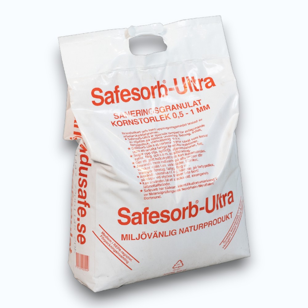Safesorb Granulat Finkornigt Ultra är ett högpresterande absorptionsgranulat som passar för både inom- och utomhusbruk. Granulatet är idealiskt för att snabbt absorbera olja, kemikalier och andra vätskor på vägbanor, arbetsytor eller andra hårda, fasta ytor. Tillverkat av kalcinerad diatomit, är Safesorb Ultra kemiskt inert och säkert att använda även på ytor där fluorvätesyra inte är tillåten.