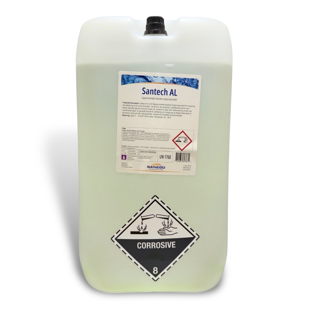 - Santech AL är ett lågskummande alkaliskt rengöringsmedel.