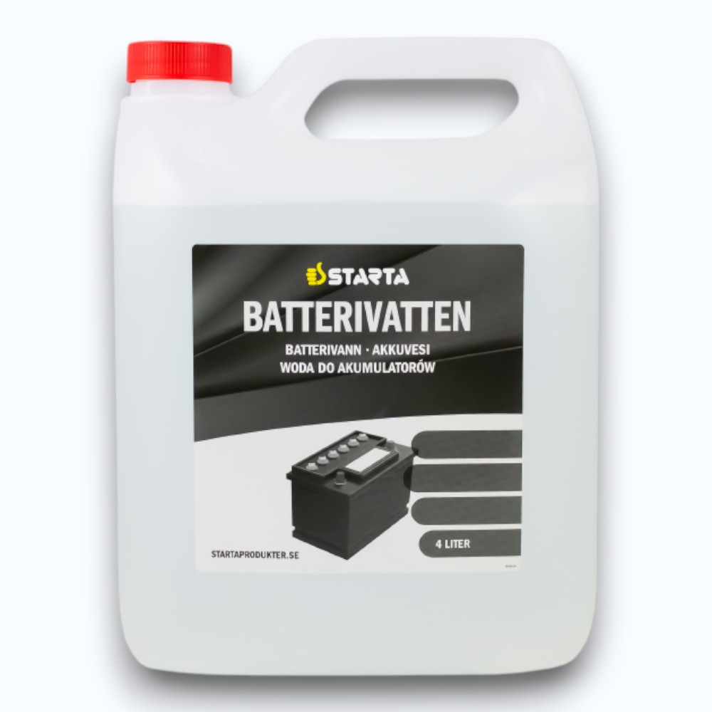 STARTA Batterivatten 4L är ett avmineraliserat och avjoniserat vatten av hög kvalitet, avsett för påfyllning av batterier till bil, båt och MC. Produkten är framtagen för att säkerställa korrekt funktion och lång livslängd på batterier genom att förhindra beläggningar och skador som kan uppstå vid användning av vanligt kranvatten.