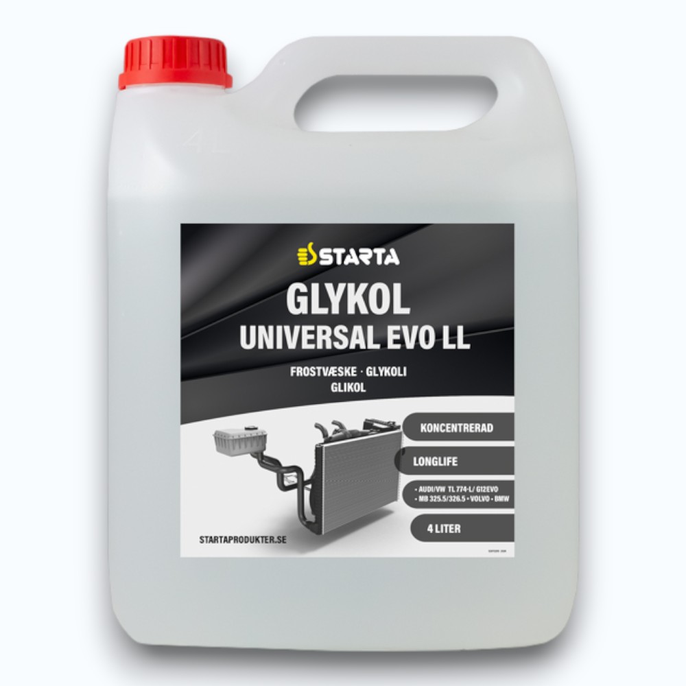Starta Glykol Universal Evo Longlife 4L är en koncentrerad etylenglykolbaserad kylarglykol som uppfyller en mängd internationella standarder och OEM-specifikationer. Produkten är framtagen för moderna och äldre motorer från många kända bilmärken och erbjuder långvarigt frysskydd och korrosionsskydd. Glykolen är blandbar med de flesta andra etylenglykolbaserade kylarglykoler på marknaden.